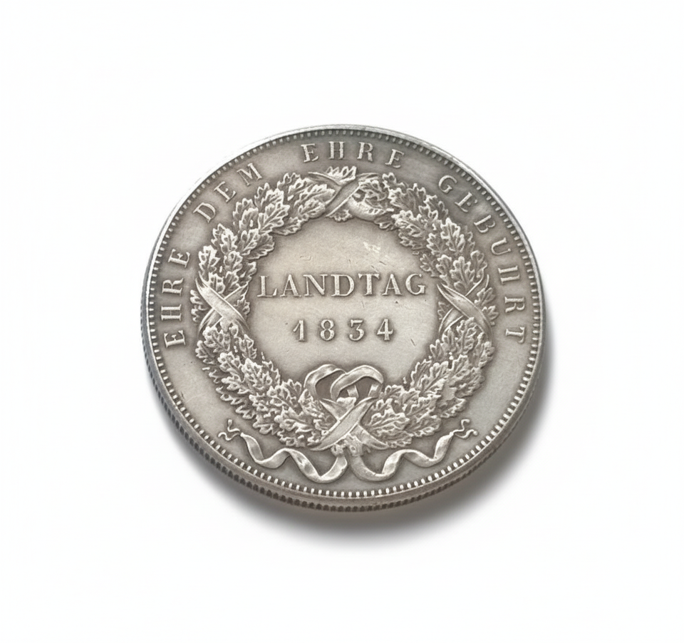 Discover this exquisite historical restrike medal, a truly exceptional collector's item. This numismatic piece commemorates King Ludwig I of Bavaria and the Landtag of 1834, offering a tangible link to 19th-century European heritage. The obverse prominently features a detailed bust of Ludwig I, King of Bavaria, renowned for his cultural contributions, with the engraver's mark 'G. VOIGT' below. The reverse proudly displays 'LANDTAG 1834' encircled by a beautiful wreath, accompanied by the inscription 'EHRE DEM EHRE GEBURT,' celebrating a significant event of the era. This art medal embodies remarkable craftsmanship and historical depth. As a commemorative restrike, it presents a fantastic opportunity for enthusiasts of German historical items and royalty. Its proof-like finish enhances its visual appeal, making it a desirable token for any serious collector. A must-have fantasy medal for those seeking unique historical artifacts. Keywords: restrike, collectible, medal, historical, commemorative, numismatic, collector's item, token, proof-like, art piece, Bavaria, Ludwig I, Landtag, 1834, heritage, vintage, fantasy medal.