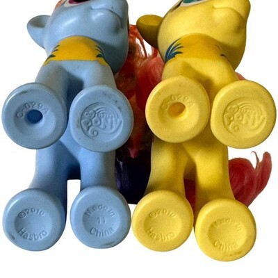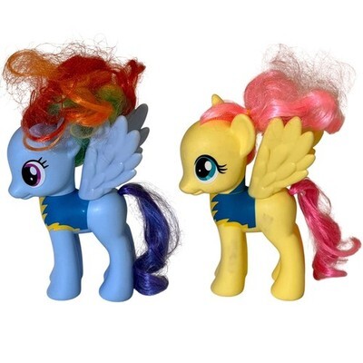 Dynamic duo from Hasbro's My Little Pony: Friendship Is Magic line ? Rainbow Dash and Fluttershy suited up as Wonderbolts in their 2010 debut design. These larger 6" figures feature detailed molded flight uniforms, rooted manes and tails, and their signature cutie marks. Rainbow Dash shines in her bold rainbow hair and confident pose, while Fluttershy's soft yellow coat and pink mane add contrast and charm. A fun, display-worthy G4 collector pair with vivid colors and strong shelf presence.