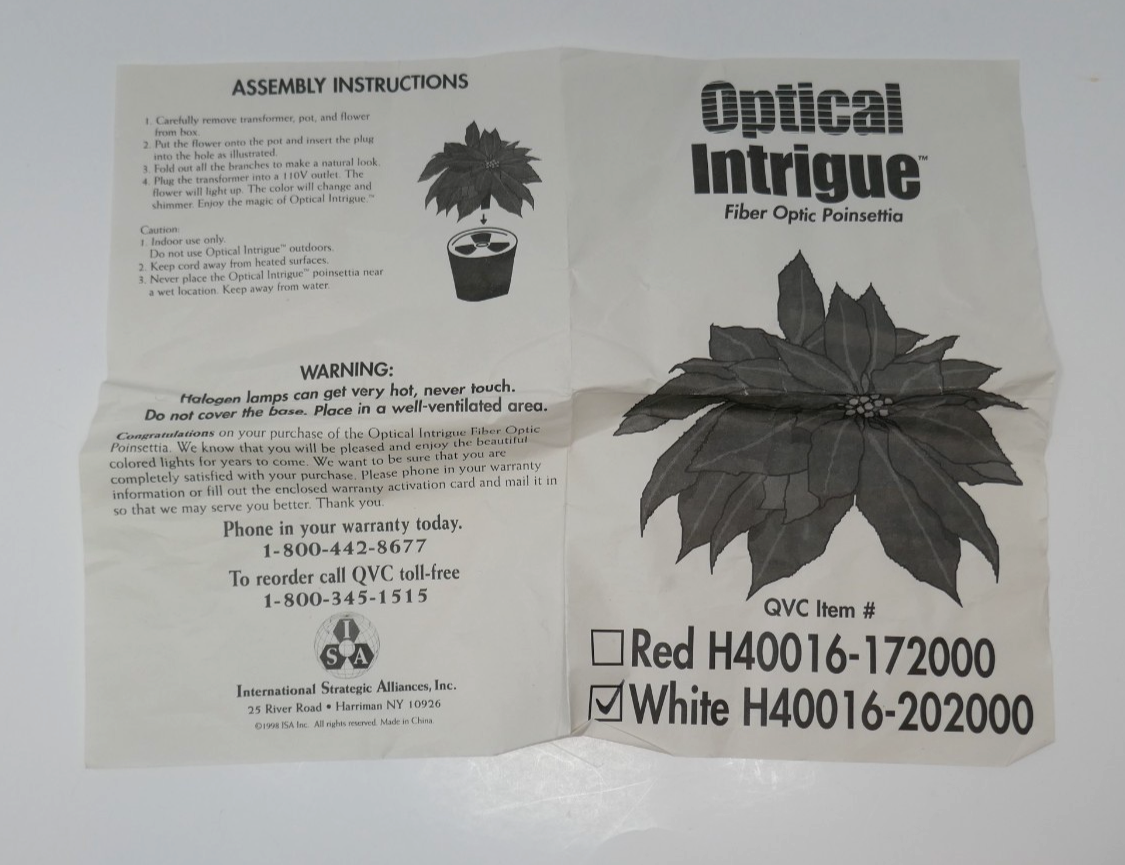 The OVC Optical Intrigue Fiber Optic Poinsettia is an artificial arrangement specifically designed for Christmas decor. Made with mixed materials and plastic, this multicolor poinsettia is perfect for adding a festive touch to your home during the holidays. This unique houseplant alternative will surely brighten up your space with its eye-catching design and vibrant colors. Will be shipped in the original box. See photos for item condition, this is a picture of the actual item. All reasonable offers considered!! **Payment** We do expect payment within 48 hours of the purchase. If for some reason you need a couple of extra days, please let us know. **Feedback** Once you have received your item, if you are satisfied, please leave feedback. We are happy to leave feedback for you after you have left feedback for us to let us know that you have received your item and the transaction is complete. Please contact us before leaving feedback if there is a problem. **International Buyers ? Please Note** Import duties, taxes, and charges are not included in the item price or shipping cost. These charges are the buyer's responsibility. Please check with your country's customs office to determine what these additional costs will be prior to bidding or buying. Check out our store for more deals!!