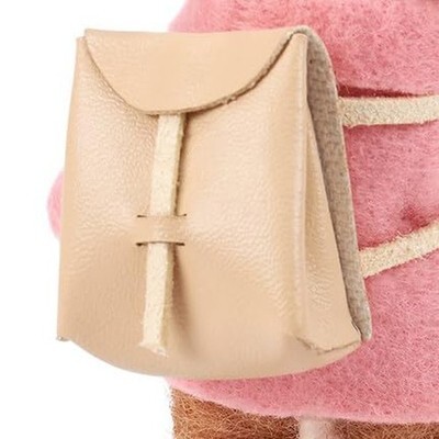 Handmade felt figurine featuring a cute student mouse with a pink coat and fabric backpack