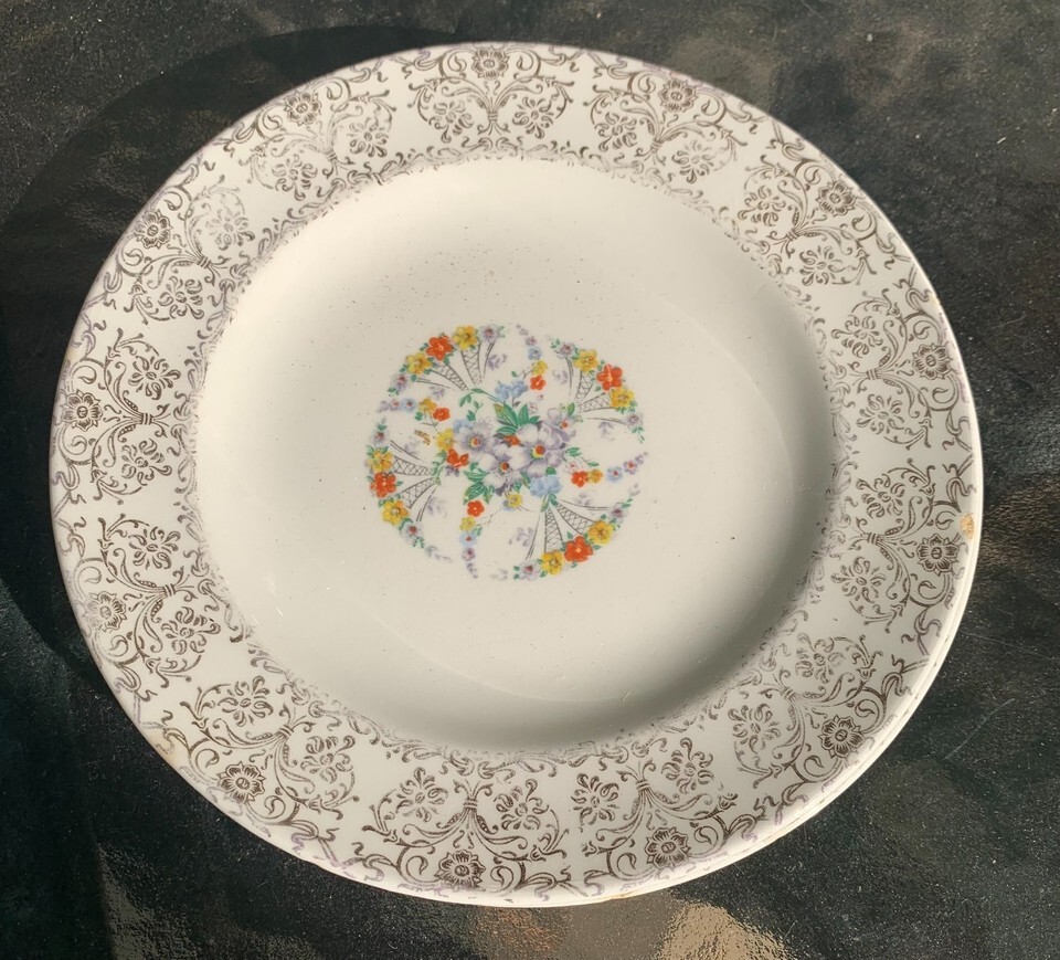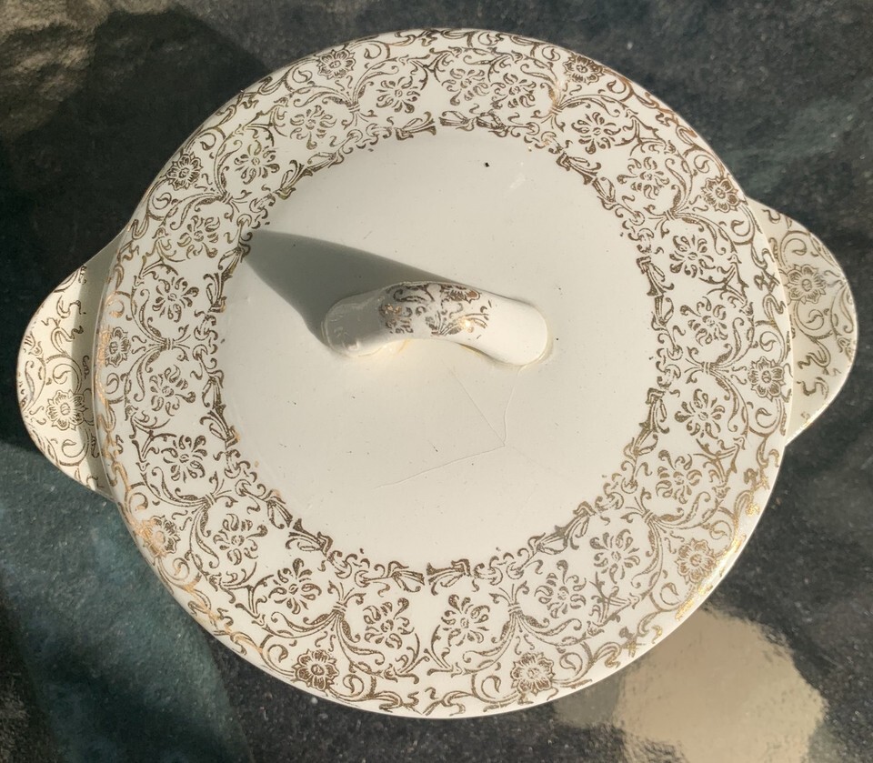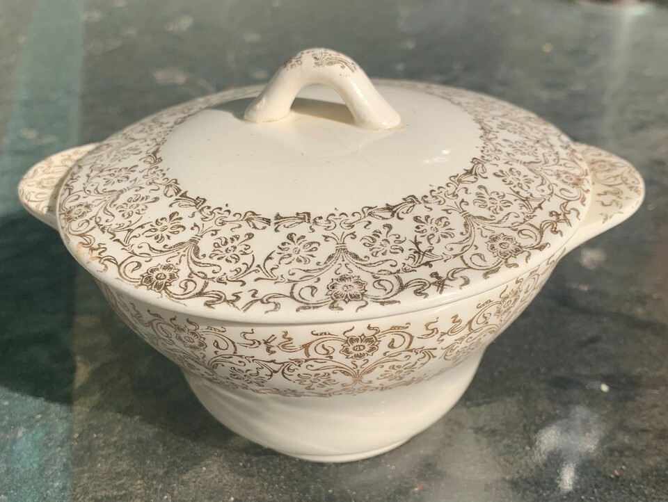 28-piece vintage China set by Royal China Inc. of Sebring, Ohio features the rare ?Ardis? pattern, adorned with 22-karat gold scrollwork and vibrant multicolor floral centers. Produced in the USA and union-stamped by the National Brotherhood of Operative Potters. Set Includes: ? 4 Dinner Plates ? 6 Soup/Salad Bowls ? 2 Small Bowls ? 2 Small Plates ? 6 Teacups (matching floral interiors) ? 5 Saucers ? 2 Creamers or Small Pitchers ? 1 Covered Serving Dish or Sugar Bowl Backstamp Details: ? ?ROYAL CHINA INC. SEBRING, OHIO / MADE IN U.S.A. / WARRANTED 22-K-GOLD / ARDIS? ? Union stamp: ?National Brotherhood of Operative Potters ? Affiliated A.F.L.? Condition: ? Most pieces in very good vintage condition ? A few pieces may show minor chips, rim wear, and gold trim loss consistent with age Shipping: Double Boxed, professionally packed with care. Insurance included.