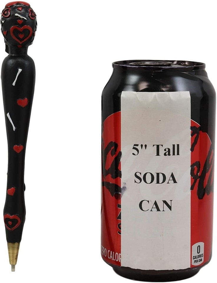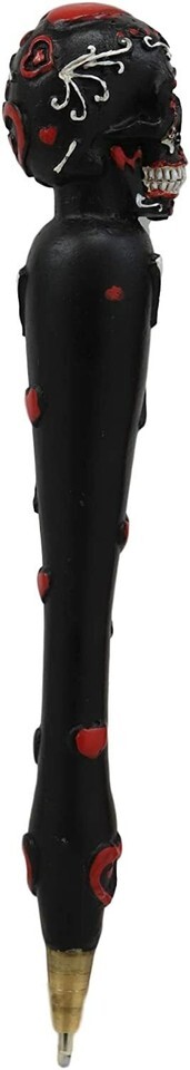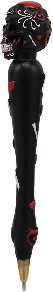 ? These Sugar Skull Pens are great additions to any office or decor scene. This particular design selection features a black color base pen with vibrant sugar skull details of bones and hearts.