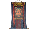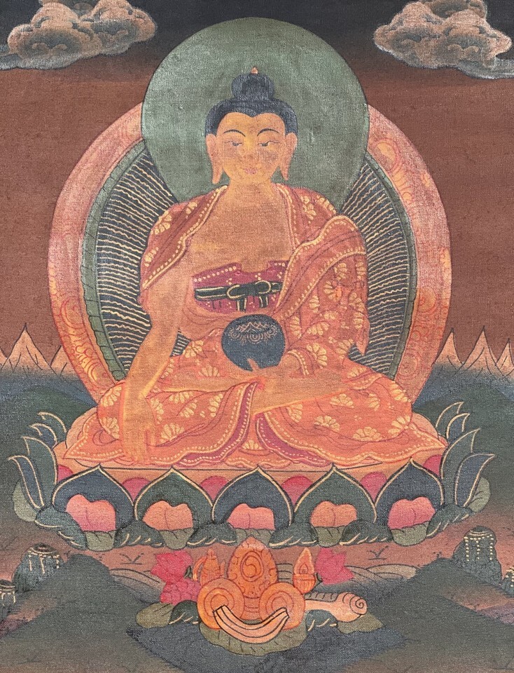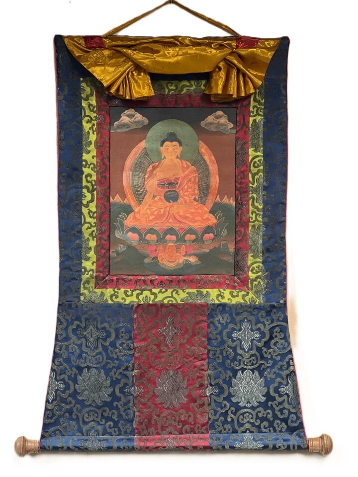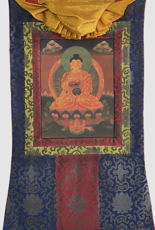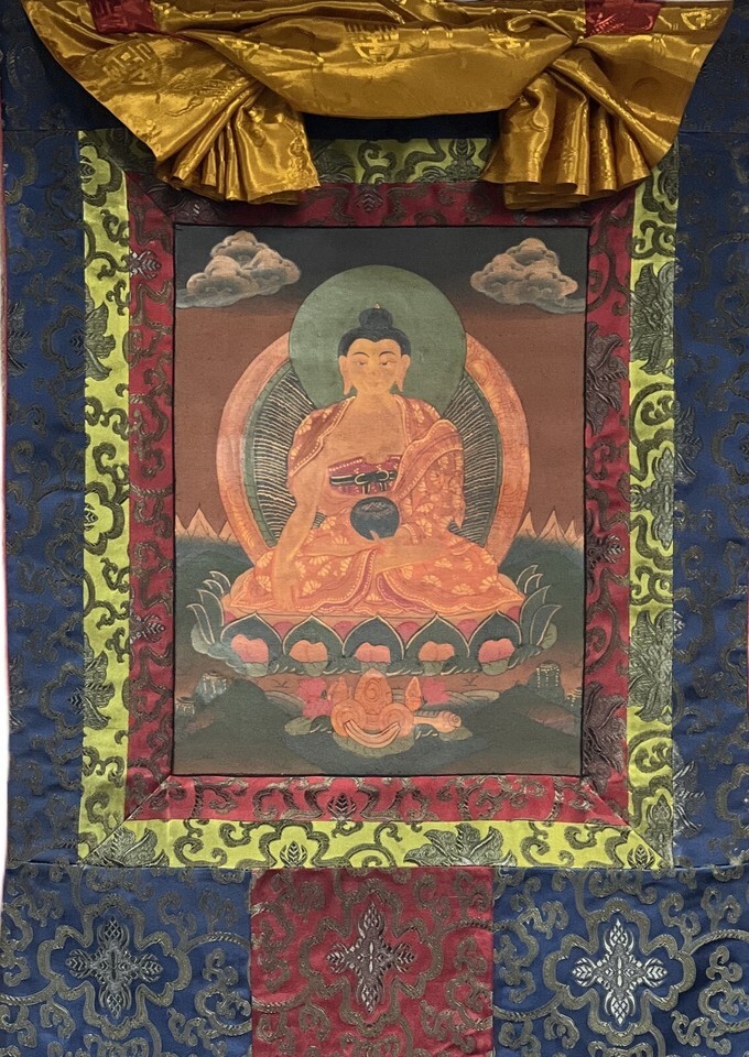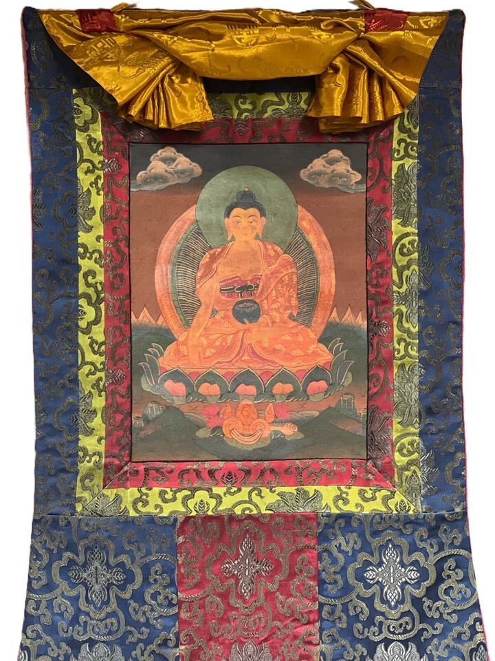- SHAKYAMUNI BUDDHA OLD OIL VARNISHED ORIGINAL TIBETAN THANGKA WITH SILK BROCADE