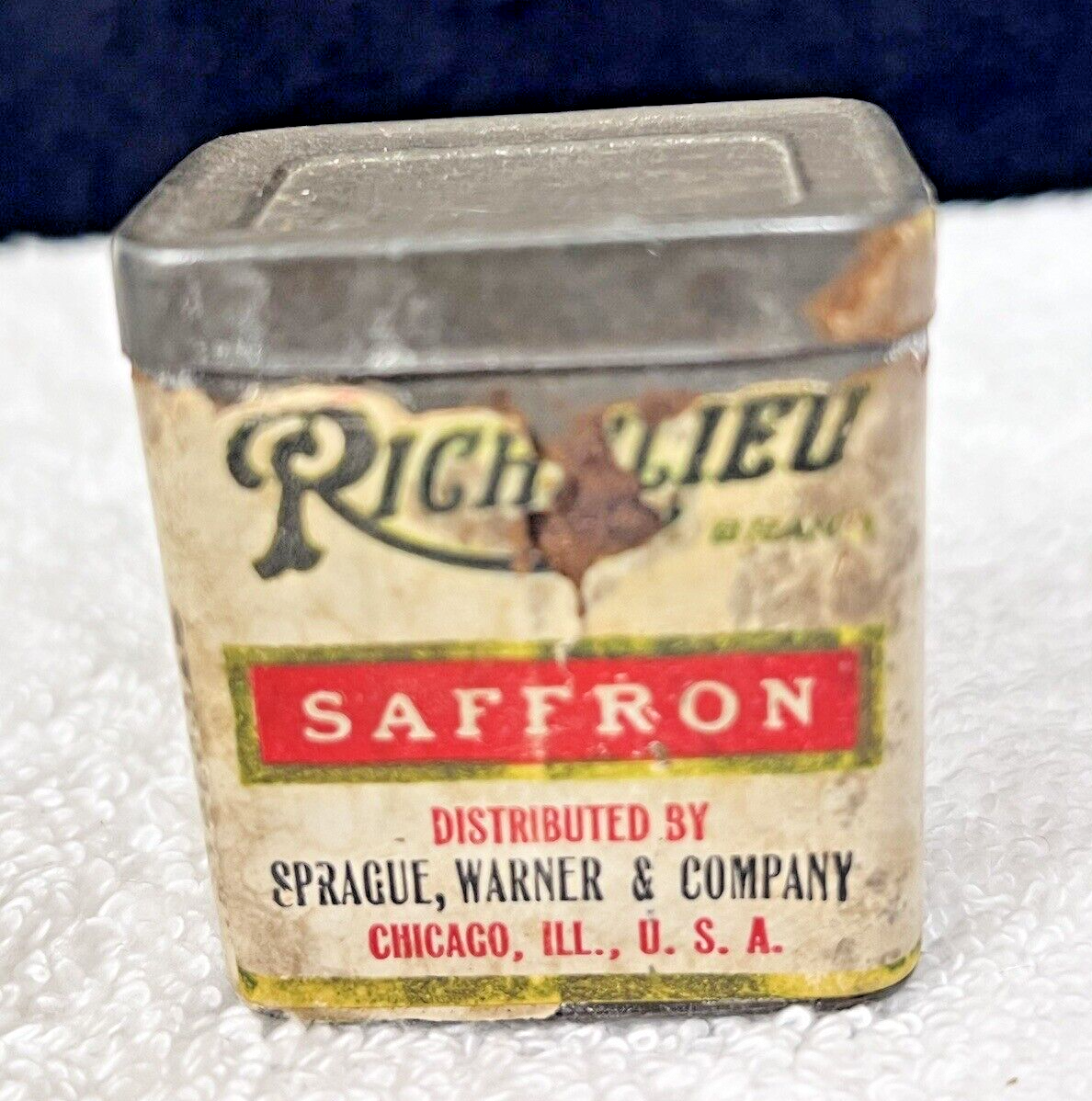 Tiny Richelieu Saffron Spine Tin Paper Over Metal Label Sprague Warner 1 7/8" the label has a few chips and the tin has some rust spots 1 7/8 inches tall x 1 5/8 x 1 1/8 inches
