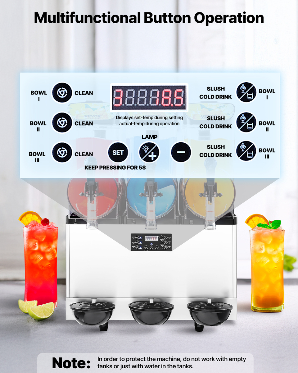 For Various Drinks: This upgraded commercial slushy machine features an adjustable temperature range of 14? ~ 50? / -10? ~ 10?, allowing you to control the softness or hardness of your drinks. For cold drink?3~5?/37.4~41?; for non-alcoholic slushie?-3~-1?/26.6~30.2?; for alcoholic drinks?-15~-6?/5~21.2?. (Recommended sugar content: around 13%, alcohol content: below 13%). It is ideal for making a variety of drinks such as juices, tea, margarita, and iced coffee.