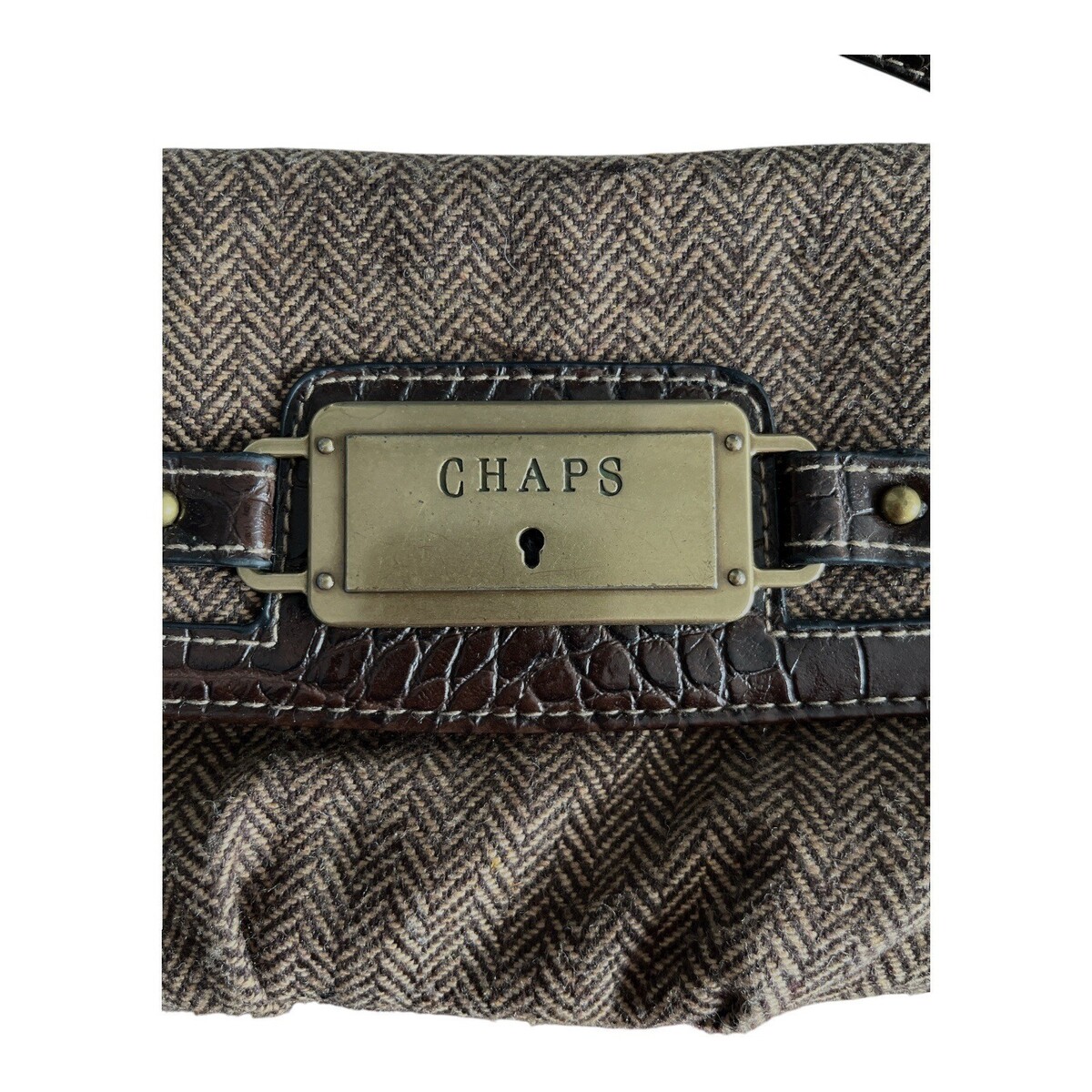 This Chaps crossbody bag features a stylish brown herringbone tweed fabric with dark brown faux leather trim and brass-tone hardware. The front flap is accented with a signature Chaps nameplate and keyhole detail. Inside, it includes multiple compartments, a zip pocket, and card slots, while the back offers an exterior zip pocket for added convenience.