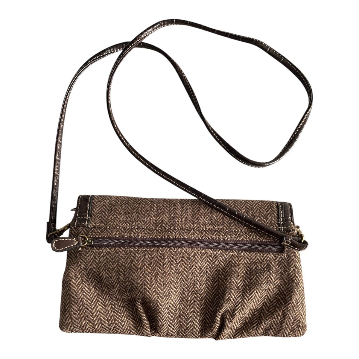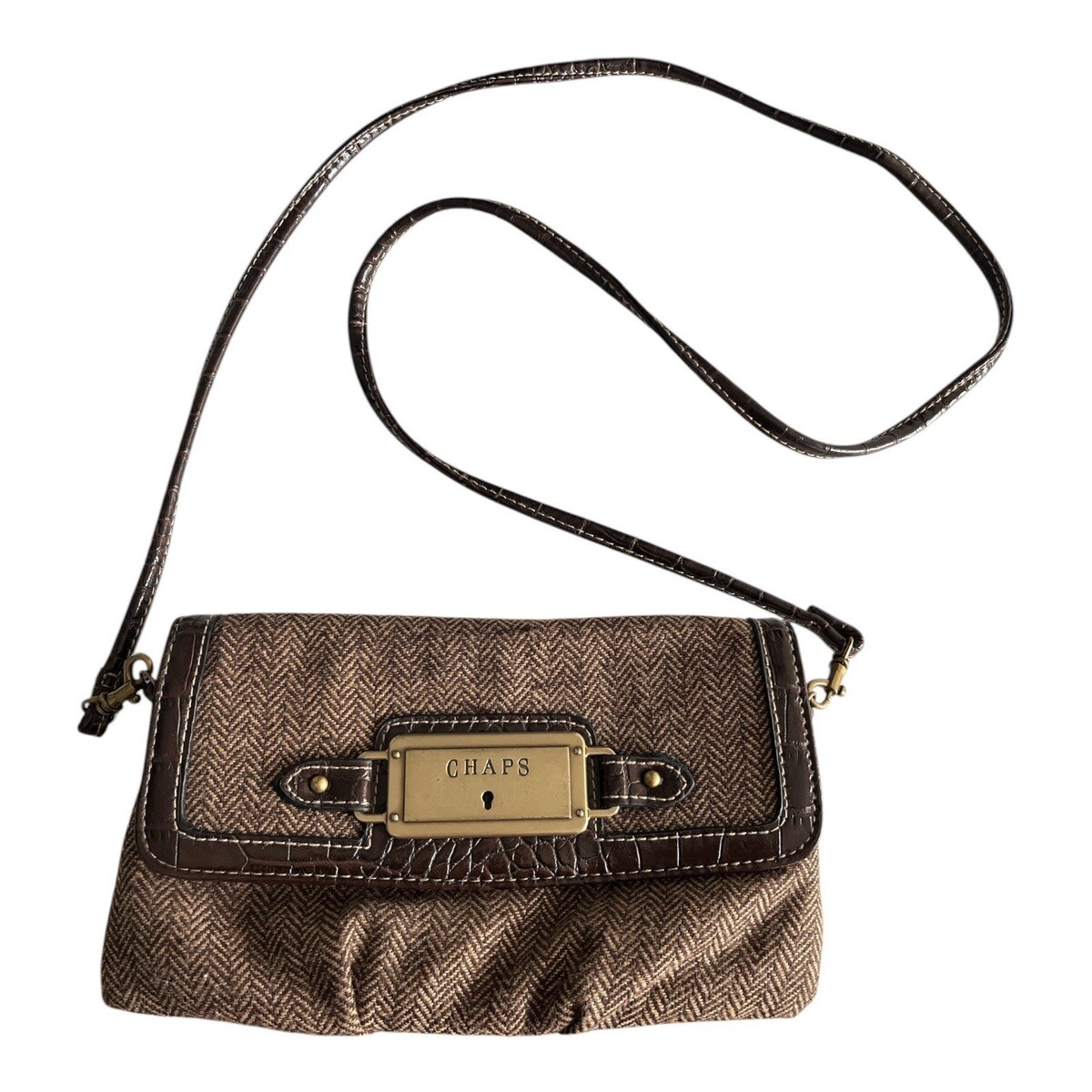 - VTG Chaps Brown Tweed Herringbone Crossbody Bag with Faux Leather Trim and Brass