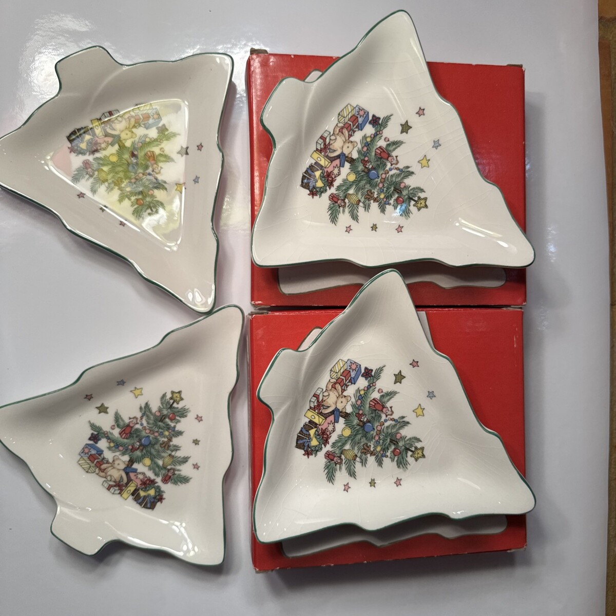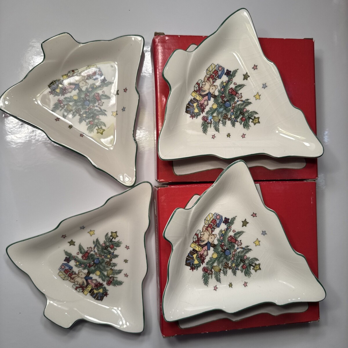 - VTG Set of 4 Nikko Happy Holidays Candy Dishes Christmastime Tree Shape 6" w/Box