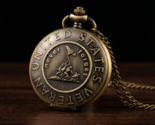Presented here is a profoundly significant vintage-inspired pocket watch, meticulously crafted as a tribute to the United States Veterans and a poignant reminder of their enduring legacy. The robust casing, finished in an elegant antique bronze tone, immediately conveys a sense of timeless honor and gravitas, ideal for collectors of military memorabilia or historical timepieces. The watch's exterior is richly detailed with meaningful inscriptions and iconography. Encircling the outer rim, bold capital letters proudly declare 'UNITED STATES VETERAN', while an inner ring bears the powerful sentiment 'never forget' in a graceful script. The centerpiece of this distinguished timepiece is a finely rendered high-relief sculpture depicting the iconic flag-raising on Iwo Jima, a seminal moment in American military history. This artistic rendition captures the heroism and sacrifice with remarkable detail, transforming the watch from a mere timekeeping instrument into a wearable piece of historical art. The aesthetic condition of this commemorative piece is exemplary, presenting a consistent antique finish with no visible signs of significant wear or damage beyond its inherent vintage character and intentional antiquing. Its substantial feel and intricate detailing speak to a quality of craftsmanship suitable for a discerning collector or as a profoundly meaningful gift. This pocket watch stands as a testament to bravery and remembrance, offering a unique blend of historical reverence and classic elegance.