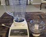 The Vintage Osterizer Galaxie Cycle Blend 10 Speed Blender with Food Processor is a classic electric blender in beige color made of plastic. It features a 5 cup capacity, 375 W power, and 10 speed settings, making it versatile for blending fruits, sauces, frozen drinks, vegetables, and smoothies. The package includes a food processor, lid, blender, pitcher, and base, making it a complete unit for all your blending needs. This Oster brand blender, model Ostet 869-18R, is a reliable and efficient appliance for any kitchen.