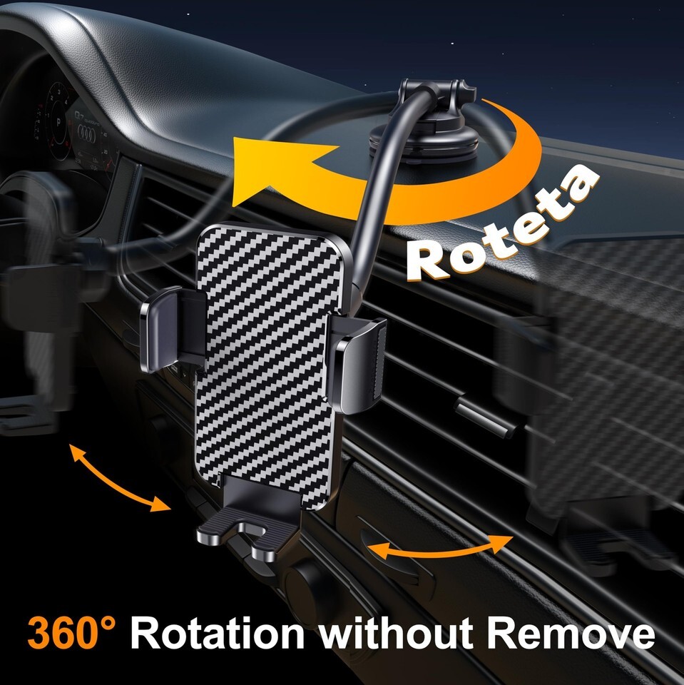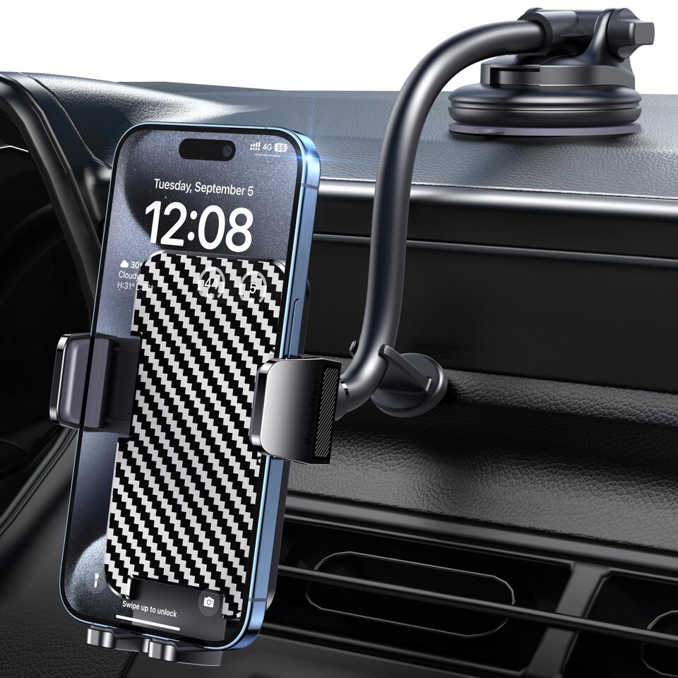 Wide view with Gooseneck Design: Car phone holder has a palm-length (16cm/6.2") aluminum gooseneck that can be freely bent and adjusted, and compared with the regular fixed-arm mount, the phone holder has a freer mounting angle by Gooseneck and a 360 joint ball which can be mounted on the dashboard or windshield at any angle without blocking the view. This phone car mount is ideal for GPS navigation and phone operation. All for optimal vision, convenience and safe driving.
