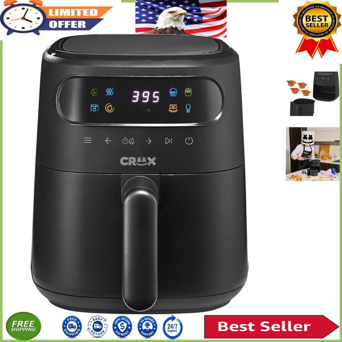 Easy Cleaning: Dishwasher-safe and PFOA-free non-stick cooking basket and crisping tray make cleanup a breeze.